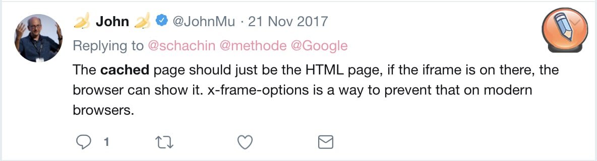 Важно отметить, что cache – это часть веб-сайта, написанная в простом HTML – он также не сохраняет JavaScript. Джон Мюллер (John Mueller), аналитик веб-мастеров в Google, подтверждает это в своем Твиттере: