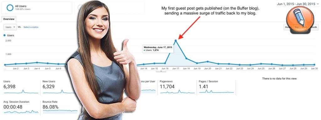 Посмотрите на этот огромный всплеск трафика, который я увидел в одном известном блоге ( 1874 читателя за один день – намного выше любого среднего показателя на данный момент времени). И это после того, как самый первый гостевой пост был опубликован несколько лет назад: