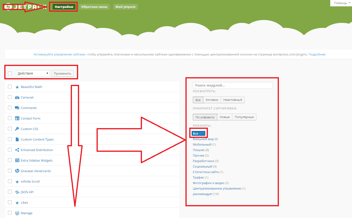 Плагин jetpack для wordpress – это целый арсенал, который заменит множество плагинов установленных у Вас на сайте. Так как этот плагин включает в себя 37 модулей, на данный момент публикации статьи, которые обладают всевозможными функциями, необходимыми для комфортной и функциональной работы вашего сайта на wordpress.