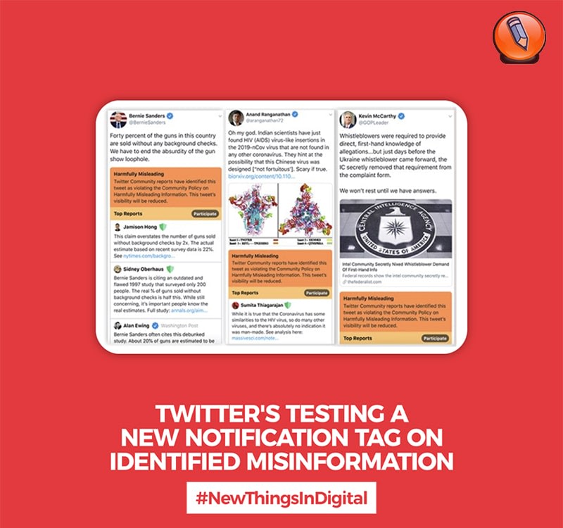 Twitter рассматривает новые ярлыки для выявленной дезинформации, с большими тегами на «вредно вводящих в заблуждение» отчетах и ссылками на справочный материал для перекрестной проверки. В этой версии дезинформация или вводящая в заблуждение информация, публикуемая общественными деятелями, будет исправляться непосредственно под твитом проверяющими факты и журналистами, которые проверены на платформе и, возможно, другими пользователями, которые будут участвовать в новой функции «отчетов сообщества», которая Демо-заявления «как Википедия.