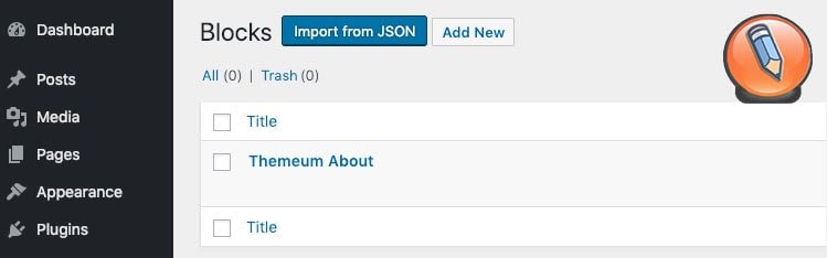 Опция экспорта блоков не отображается, пока Вы не наведете курсор на имя блока. При наведении курсора на имя блока в нижней части каждого сохраненного блока отображаются такие параметры, как «Редактировать», «Корзина» и «Экспорт в формате JSON».