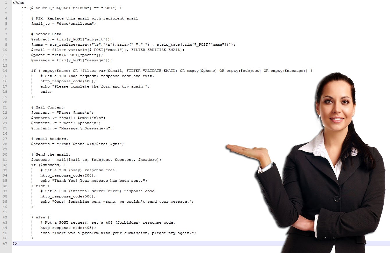 Что мы делаем с данными, которые мы получили от пользователя? Мы храним это где-то. Правильно?! Но вместо этого мы можем отправить электронное письмо. Для этого мы пишем mail скрипт PHP. Скопируйте следующий код и сохраните его под именем mail.php.