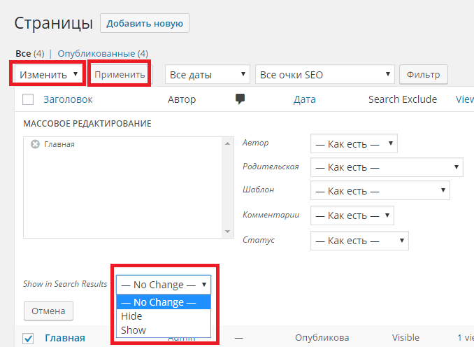 Скрытие постов или страниц из поиска поддерживает массовое редактирование в системе WordPress. Если отметить несколько страниц, которые нужно «Изменить» и установить соответствующий параметр в опции «Show in Search Results».