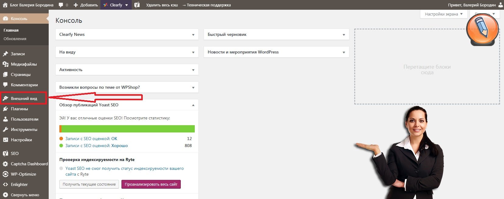 Установив WordPress, Вы сможете войти в панель управления, которая выглядит следующим образом: