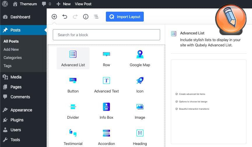 Чтобы начать добавлять расширенные функции в свои списки, Вам необходимо убедиться, что Вы используете последнюю версию Qubely, универсального набора инструментов Gutenberg, на своем сайте WordPress. Вы можете найти Qubely в каталоге плагинов WordPress.org.