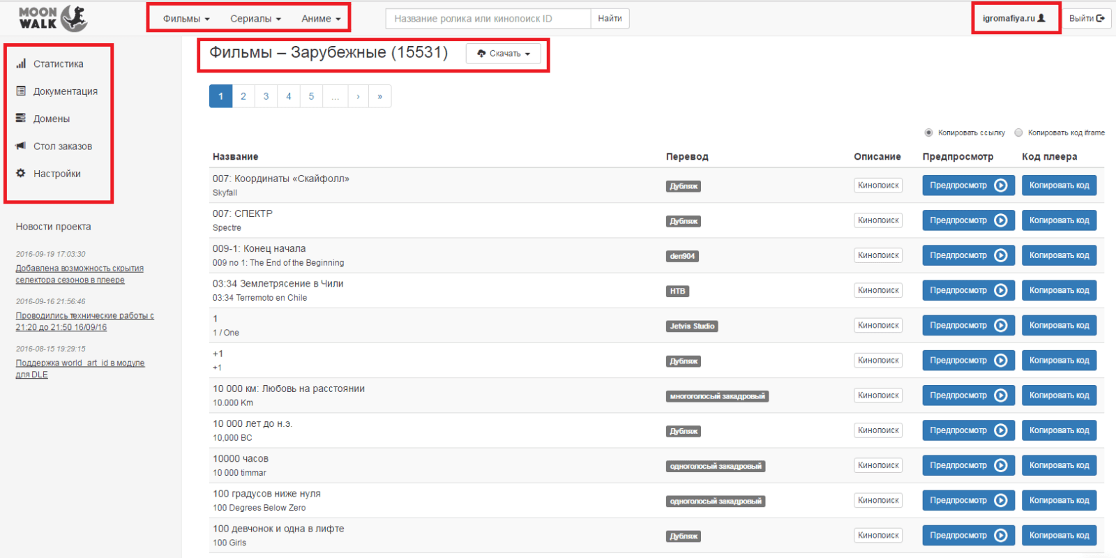 А вот скриншоты сервиса MoonWalk и MoonWalk личный кабинет с фильмами, которые можно установить к себе на киносайты с помощью кода: