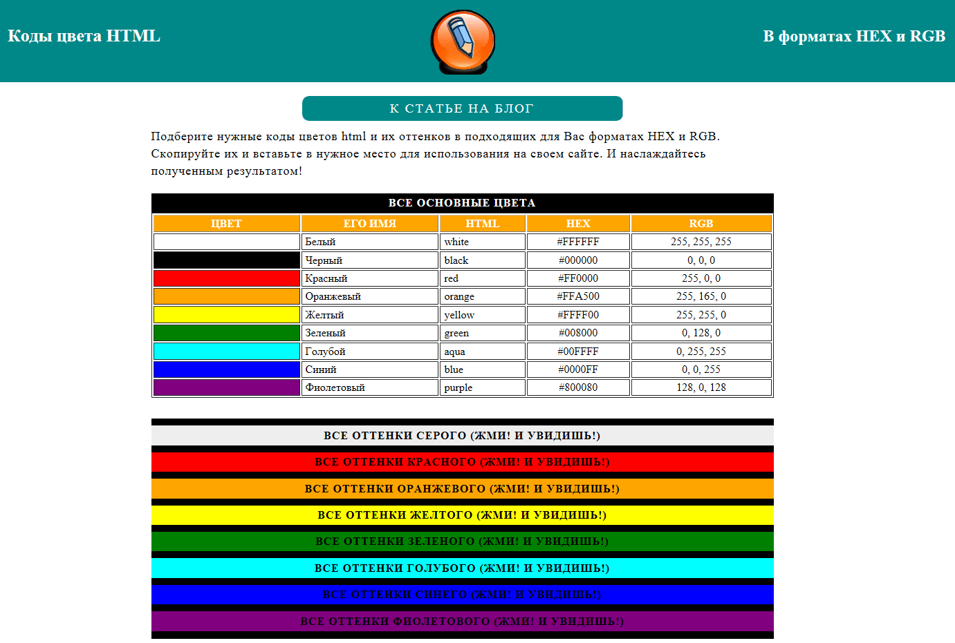 Теперь нажмите на кнопку, которая расположена ниже и Вы сможете перейти на страницу, где выберите для себя коды цветов в html и их все оттенки в форматах HEX и RGB.