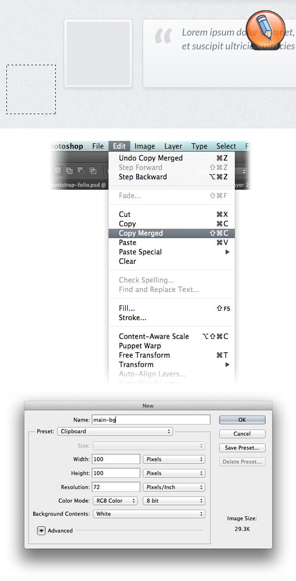Для нарезки фоновых изображений мы будем использовать немного другую технику, которую я продемонстрирую на основном фоне. Выберите инструмент Rectangular Marquee Tool (M), удерживайте нажатой клавишу Shift и создайте выделение квадрата на сером текстурированном фоне области свидетельства.