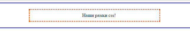 <!DOCTYPE html> <html lang="ru"> <head> <meta charset="utf-8" /> <title>Первый пример рамки css</title> <style> body{ border: 2px solid #0000FF; } p{ text-align: center; text-indent: 30px; border: 3px dotted #ff4f00; padding: 10px 20px 10px 20px; margin: 20px auto; width: 400px; } </style> </head> <body> <p> Наши рамки css! </p> </body> </html>
