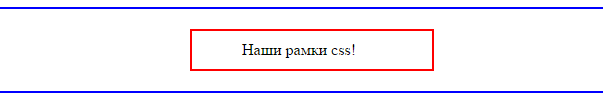<!DOCTYPE html> <html lang="ru"> <head> <meta charset="utf-8" /> <title>Первый пример рамки css</title> <style> body{ border: 2px solid #0000FF; } p{ text-indent: 30px; border: 2px solid #FF0000; padding: 10px 20px 10px 20px; margin: 20px auto; width: 200px; } </style> </head> <body> <p> Наши рамки css! </p> </body> </html>