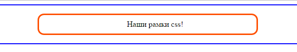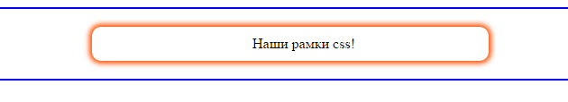 <!DOCTYPE html> <html lang="ru"> <head> <meta charset="utf-8" /> <title>Первый пример рамки css</title> <style> body{ border: 2px solid #0000FF; } p{ text-align: center; border-radius: 10px; box-shadow: 0 0 0 3px #ff4f00; text-indent: 30px; padding: 10px 20px 10px 20px; margin: 20px auto; width: 400px; } </style> </head> <body> <p> Наши рамки css! </p> </body> </html>