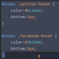 #icons .twitter:hover { color:#6cadde; bottom:5px; } #icons .facebook:hover { color:#3b5998; bottom:5px; }