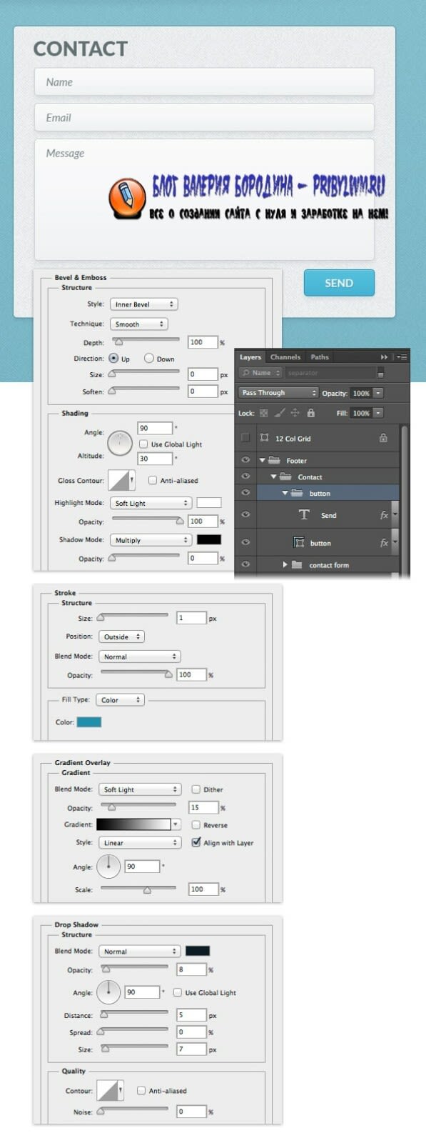 Теперь мы создадим кнопку «Отправить». Создайте новую группу и назовите ее «кнопка». Выберите инструмент Rounded Rectangle Tool (U), установите радиус 4px и создайте прямоугольник с размерами 98px на 36px и цвет # 4dbada. Дважды щелкните этот слой, чтобы открыть окно «Стиль слоя» и использовать настройки со следующего изображения. Для эффекта Stroke я использовал цвет # 218fae.