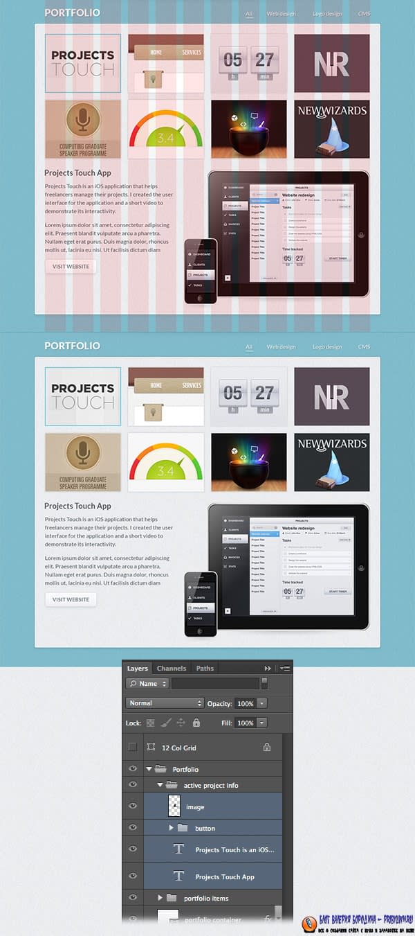 Создайте новую группу и назовите ее «активная информация о проекте». Я разделил эту область на два основных столбца: один для текста, который равен ширине 5 столбцов сетки 960, а другой – для images, который шириной до 7 столбцов сетки.