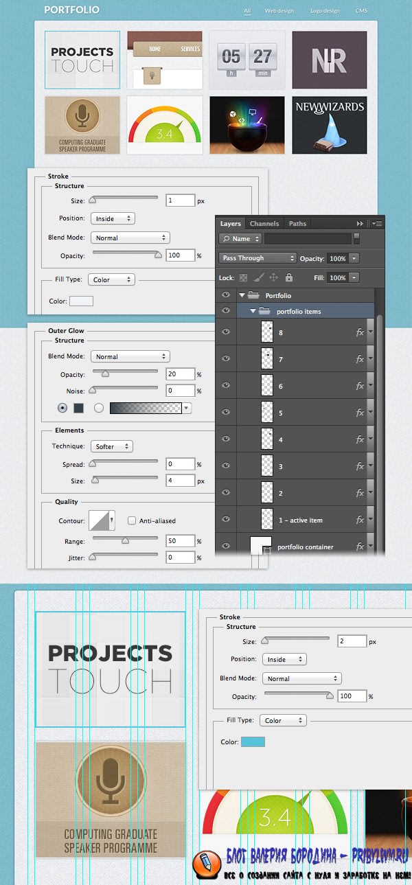 Примените следующие настройки для Stroke и Outer Glow ко всему вашему портфолио. Для эффекта Stroke я использовал цвет # f0f3f7, а для эффекта Outer Glow я использовал # 35424a.