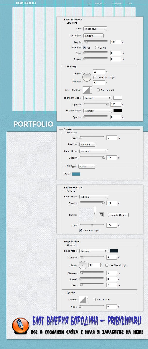 Назовите этот слой «портфолио портфолио», дважды щелкните его, чтобы открыть окно «Стиль слоя», и используйте настройки из следующего изображения. Для эффекта Stroke я использовал цвет # 428ca1.