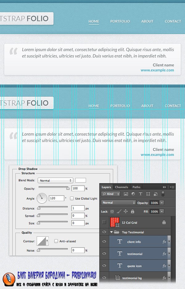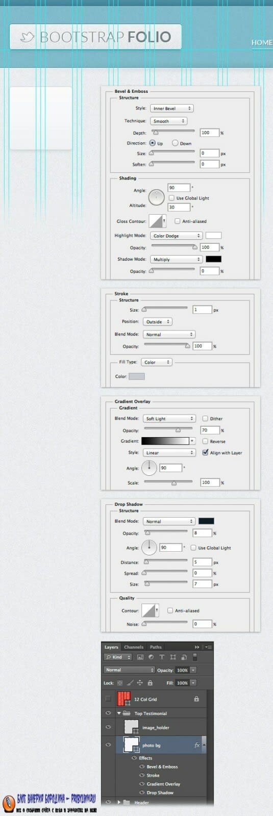 Скопируйте стиль слоя с слоя «photo bg» и вставьте его в это. Назовите этот слой «testimonial bg» и убедитесь, что он выровнен по сетке и фоторамке.