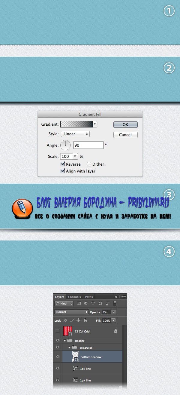 Назовите этот слой «разделителем». Дублируйте его два раза и поместите один разделитель в верхней части каждого абзаца текста.