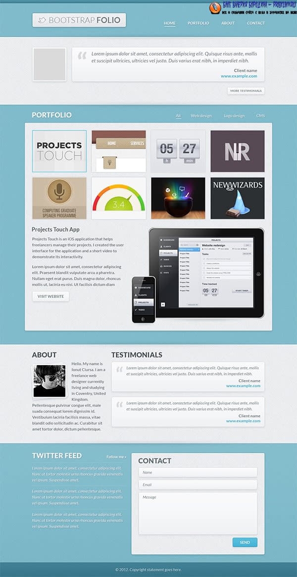 Здравствуйте, уважаемые друзья и гости блога Pribylwm.ru! Сегодня мы с Вами будем изучать как создать портфолио бесплатно используя при этом все, что есть под рукой. А именно: Bootstrap, Adobe Photoshop CS6, 960 Grid System, а также мы с Вами будем пользоваться для создания нашего нового портфолио Twitter Bootstrap, HTML5 и CSS3. Давайте посмотрим, что из этого может получится? Вам интересно?! Тогда, поехали …