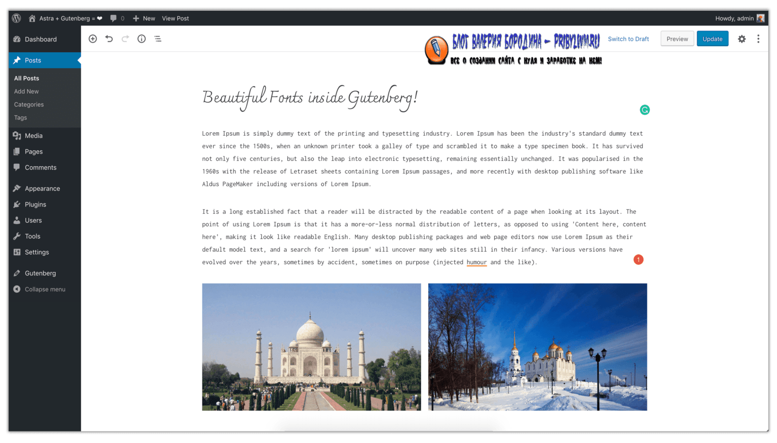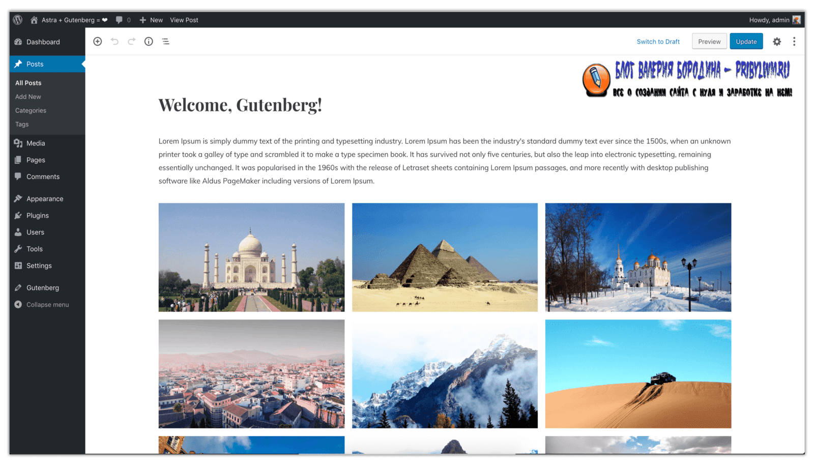 WordPress визуальный редактор – Astra полностью совместима с Gutenberg! Посмотри, как это работает: