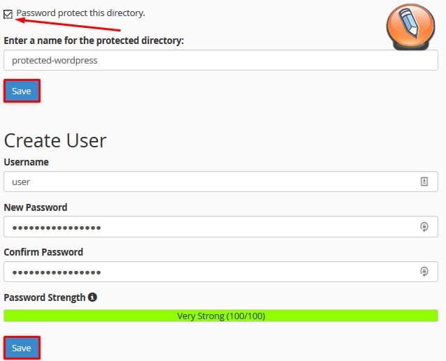 - Теперь выберите параметр Защита паролем этого каталога и введите имя каталога, который Вы хотите защитить. Нажмите кнопку «Сохранить». Используйте форму и создайте учетную запись пользователя, которая сможет получить доступ к защищенному каталогу. Нажмите кнопку «Сохранить», как только Вы закончите.