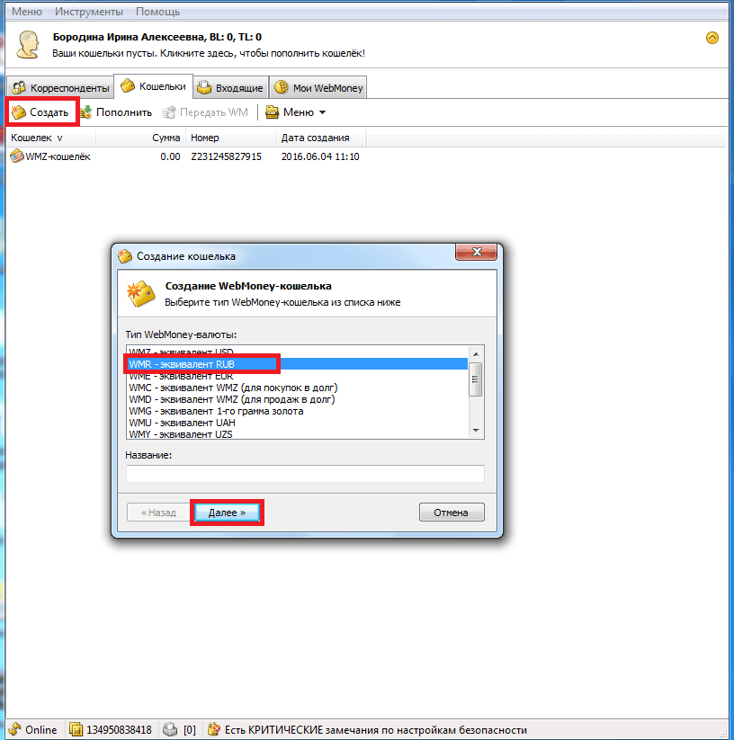 Для этого вам нужно войти в свой keeper classic и там произвести вот такие не очень хитрые действия. Нажать кнопку “Создать” в открывшемся окошке выбрать нужный для Вас кошелек вебмани, на примере это WMR и дать ему название, а затем нажать на кнопку “Далее”: