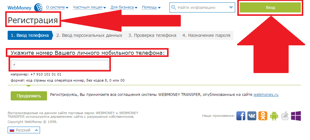 Здесь вам нужно ввести свой номер телефона, как предлагается, с соблюдением всех требований и далее нажать на кнопку “Продолжить”. И Вы попадете на следующий этап, чтобы зарегистрировать webmoney.