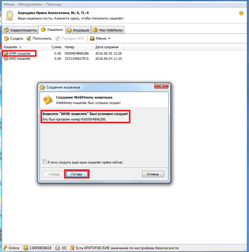 Жмите кнопку “Готово” и пользуйтесь своим вновь созданным кошельком вебмани.