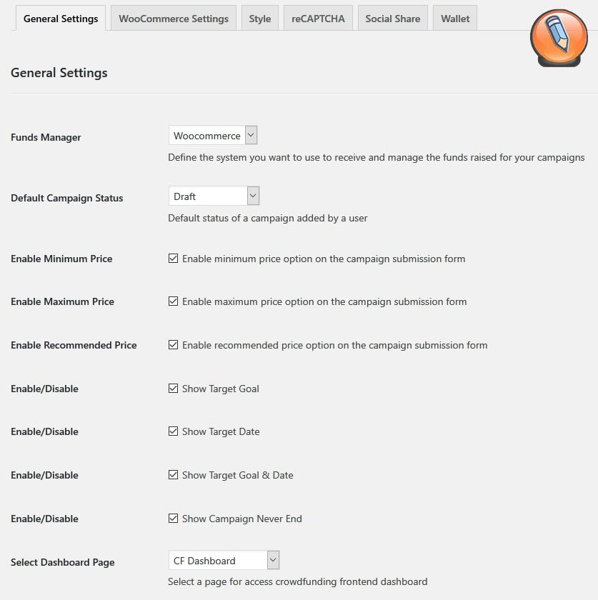 Плагин WP Crowdfunding поставляется с множеством опций, которые помогут Вам настроить вашу кампанию. Чтобы получить доступ к этим настройкам, перейдите к общим настройкам в «Crowdfunding», найденном на левой панели.