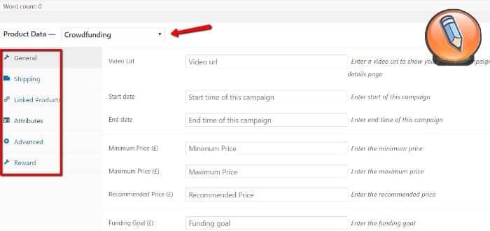 Выберите тип продукта как «Краудфандинг». Введите все необходимые данные на вкладке «Общие».