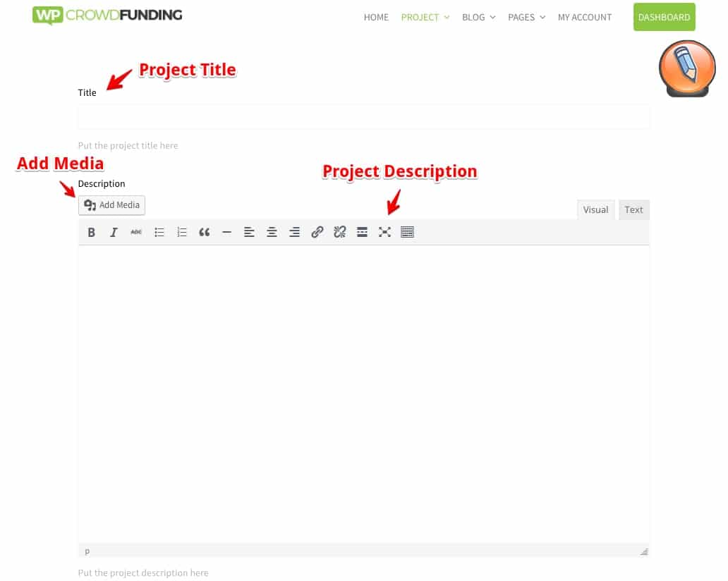 Чтобы добавить интерфейсные формы для пользователей, необходимо добавить соответствующие шорткоды WP Crowdfunding на выбранные страницы. Это очень просто с помощью выпадающего меню в редакторе WordPress.