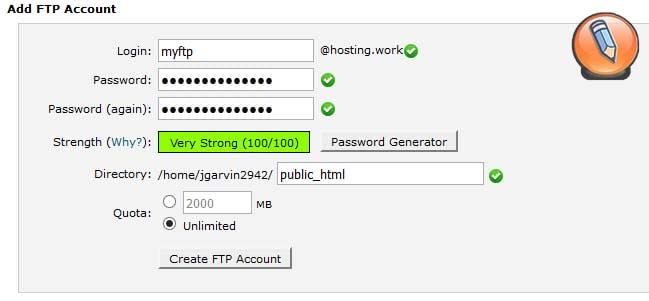 После нажатия значка «Учетные записи FTP» откроется новая страница, на которой Вы дадите учетные данные для входа и пароля. В поле каталога введите public_html, затем нажмите кнопку «Создать учетную запись FTP».