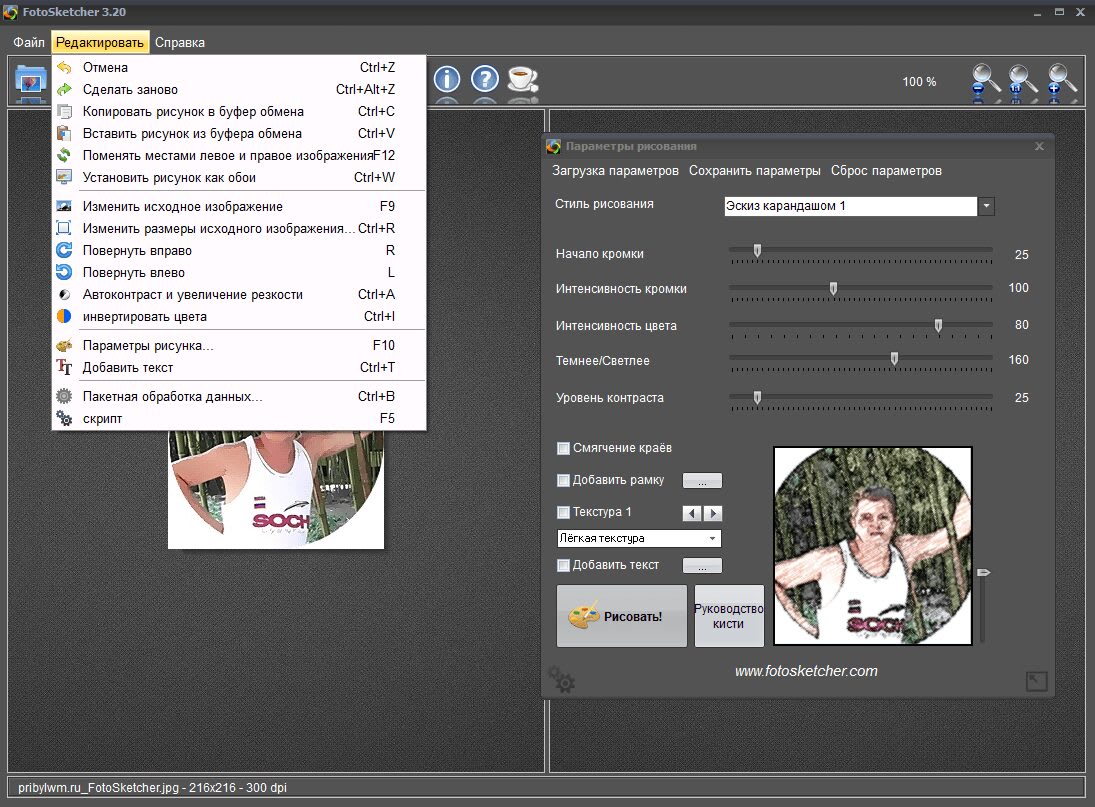 Программа fotosketcher очень проста в использовании и что наиболее важно имеет русский интерфейс управления. С помощью этого фоторедактора можно очень быстро преобразовать любую фотографию или рисунок по вашему вкусу и использовать его для ваших целей на блоге.
