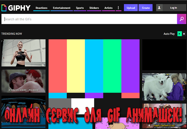 Просто найдите любое видео например на Youtube и скопируйте ссылку на него. Зайдите в сервис giphy.com для создания gif из видео онлайн. Нажмите на кнопку “Create” вверху. Затем вставьте ссылку на видео в строку поиска в онлайн сервисе и сервис сам начнет загрузку вашего выбранного видео, сразу же! И Вы увидите вот такую картинку, но естественно с вашим видео: