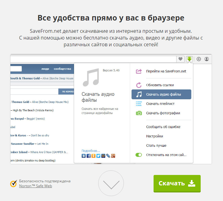 SaveFrom – это даже не программа в своем чистом виде, а специальное браузерное расширение, которое позволяет скачивать видео и mp3 файлы с любых сайтов. Вот вам подтверждение: