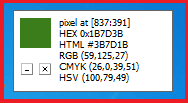Затем запустить программу pixie и навести курсор вашей мыши на нужную вам точку и программа pixie покажет вам цвет под курсором в следующих форматах: hex, RGB, HTML, CMYK и HSV.