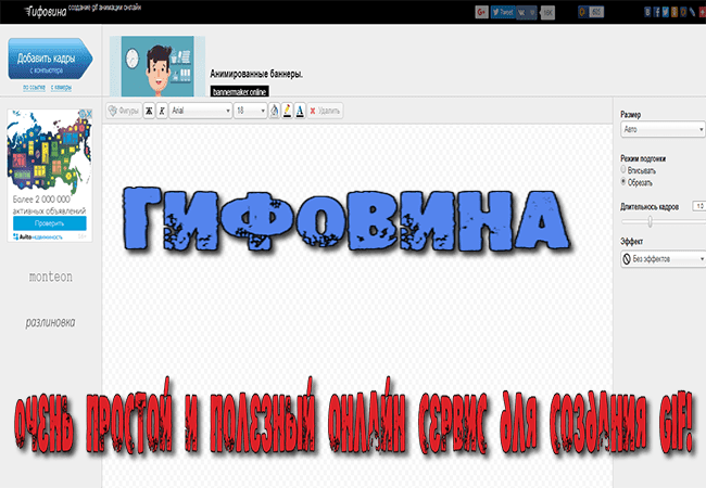 Как я уже говорил выше по тексту, существует множество специальных онлайн сервисов для того, чтобы создать gif онлайн из фото и любых картинок. Но я сегодня остановлюсь только на одном из них, который мне больше всего понравился своей доступностью, простотой исполнения и работы в нем, ну и конечно же бесплатностью. Этот онлайн сервис для создания gif анимации называется – Гифовина.