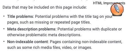 Некоторые отчеты, на которые разработчики SEO полагались при поиске и устранении неисправностей в старых инструментах для веб-мастеров версии GSC, либо восстанавливаются в новом инструменте проверки URL, либо появляются в отчете Coverage, либо могут быть фактически полностью удалены. К ним относятся улучшения HTML, ошибки сканирования, выборка из Google и многое другое.