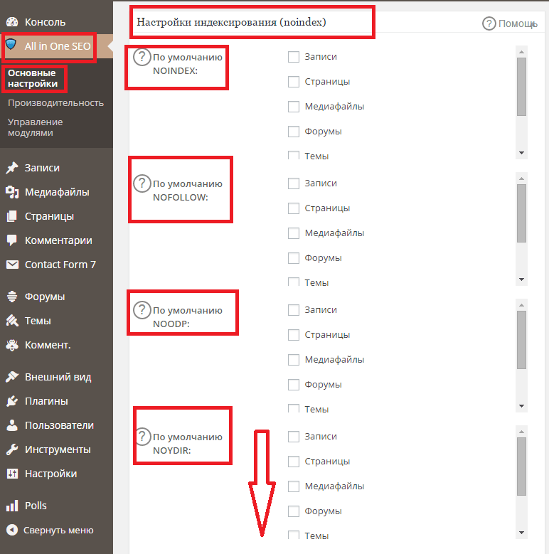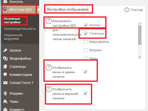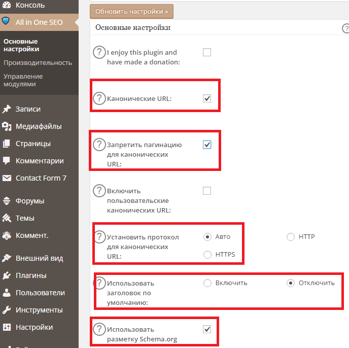И после этих действий Вы попадете в панель all in one seo pack: “Основные настройки“. Далее вам нужно будет отметить все как показано на скриншоте, который я вам подготовил: