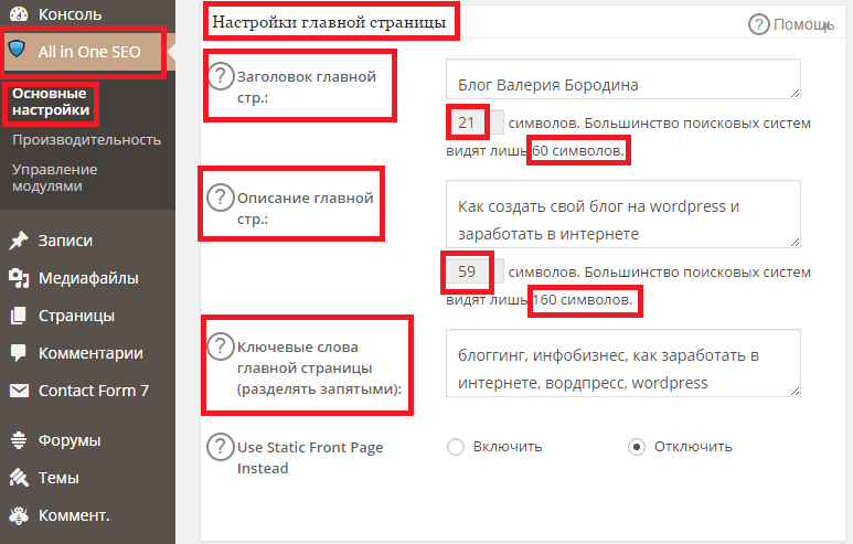 Далее прокручиваем ниже и видим “Настройки главной страницы“. Здесь вам нужно вписать свой заголовок, описание страницы и ваши ключевые слова. Сколько символов принимается и допустимо, там все указано и на скриншоте я выделил красным: