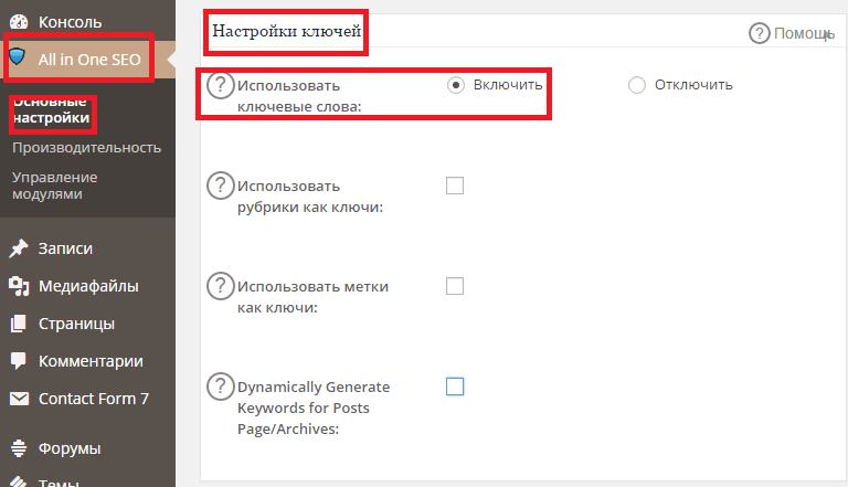 Идем дальше вниз и видим “Настройки ключей“. Делаем как на моем скриншоте, то есть ставим галочку только на против “Использовать ключевые слова” – “Включить“: