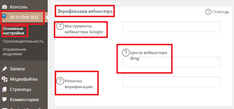 Следующий пункт настроек плагина all in one seo pack “Верификация вебмастера“. В этих полях нужно прописать верификационные коды для вашего блога в данных ресурсах. Все просто, регистрируете ваш блог и прописываете коды вот здесь: