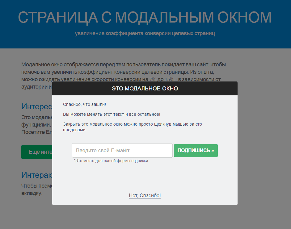 Вот смотрите живой пример модального окна на отдельной целевой странице, чтобы повысить конверсию: