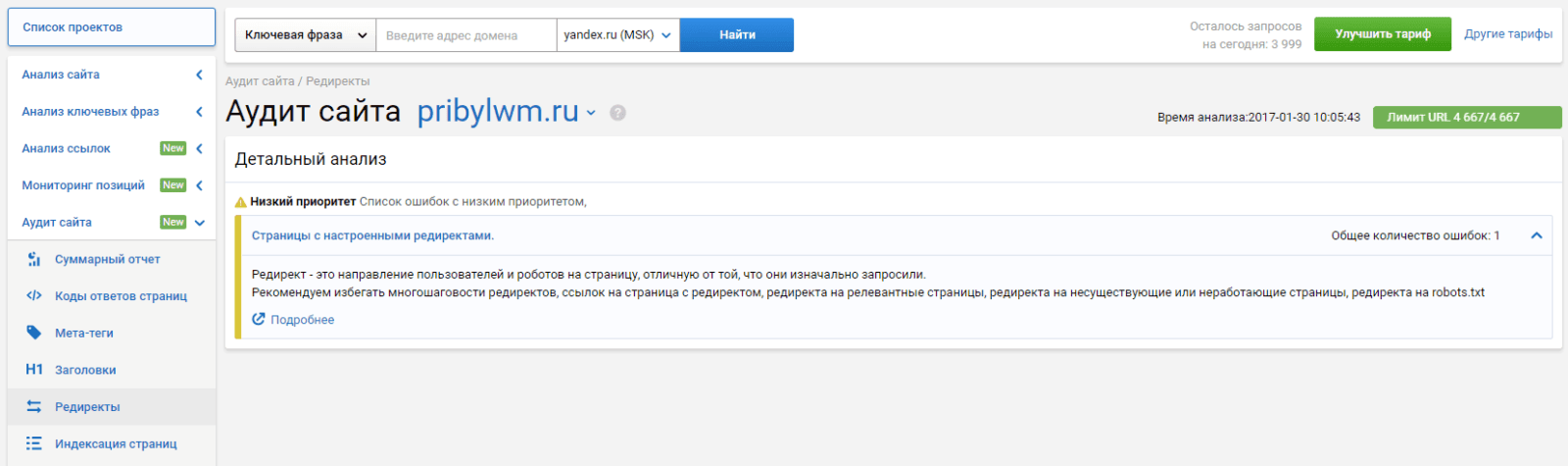 Теперь посмотрим, что нам выдал отчет про “Редиректы“: