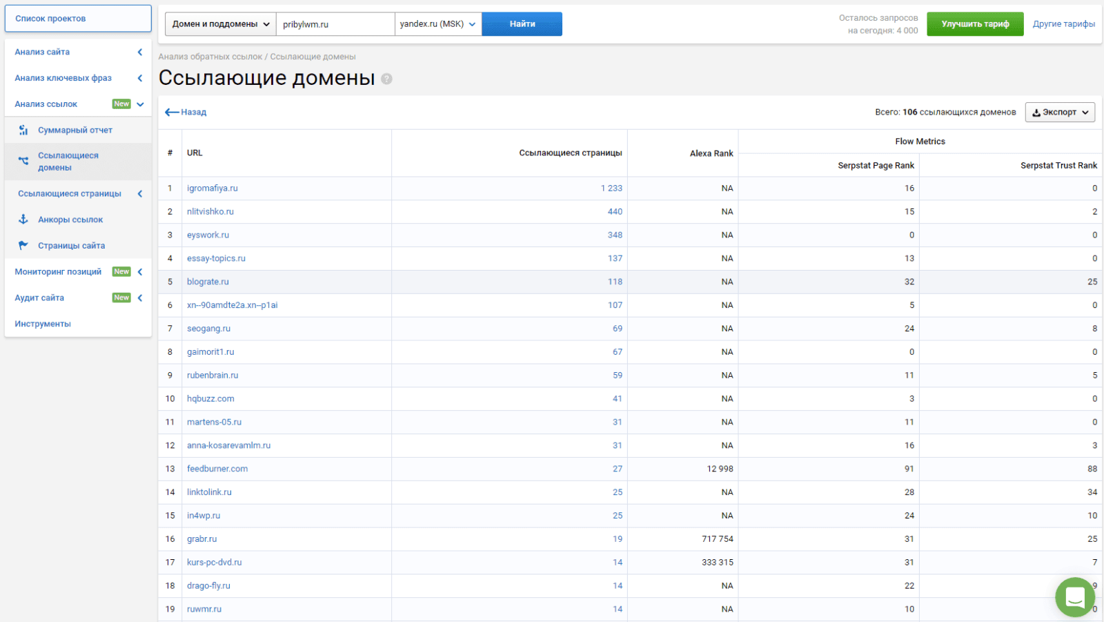 Затем, после как Вы создали там свой аккаунт, переходим во вкладку “Анализ ссылок” и далее в ней находим “Ссылающиеся домены“: