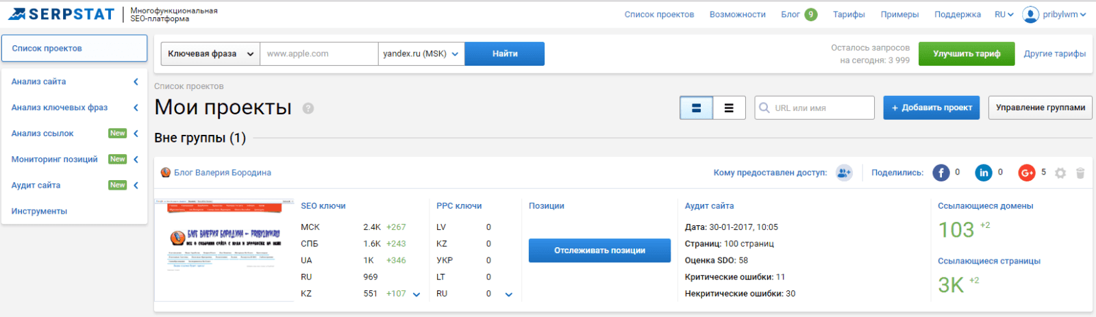Тогда давайте начнем с вами знакомство с сервисом Serpstat, который нам и поможет разобраться со всеми, казалось бы не значительными, проблемами в SEO продвижении и раскрутке сайта. Я как уже выше говорил, сегодня постараюсь сделать полный обзор данного сервиса и на примере своего сайта выявить все недостатки, чтобы затем их исправить.