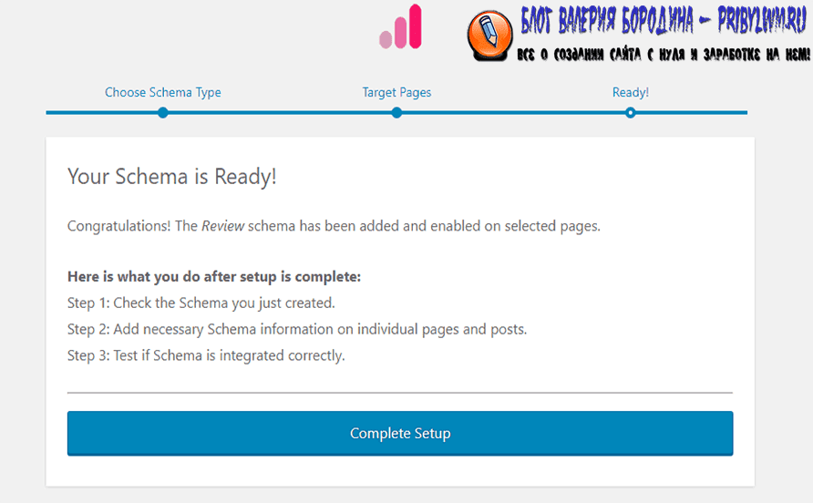 Когда Вы закончите мастер настройки, будьте готовы добавить свою первую схему. Это информация, которая поможет Вам добавить расширенные сниппеты google в WordPress.