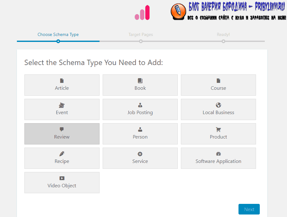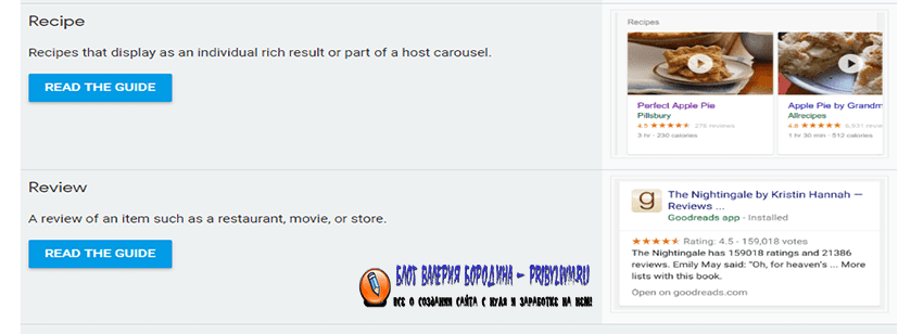 Например, если Вы хотите получить эти расширенные сниппеты, Вы можете выбрать опцию Review . Или, если Вы пишете рецепты, должны выбрать тип рецепта.
