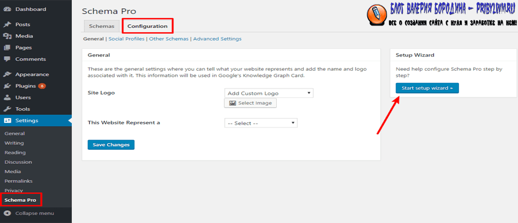 После активации плагина перейдите в «Настройки» → «Schema Pro». Затем перейдите на вкладку «Конфигурация» и нажмите «Начать настройку», чтобы настроить основную информацию вашего сайта: