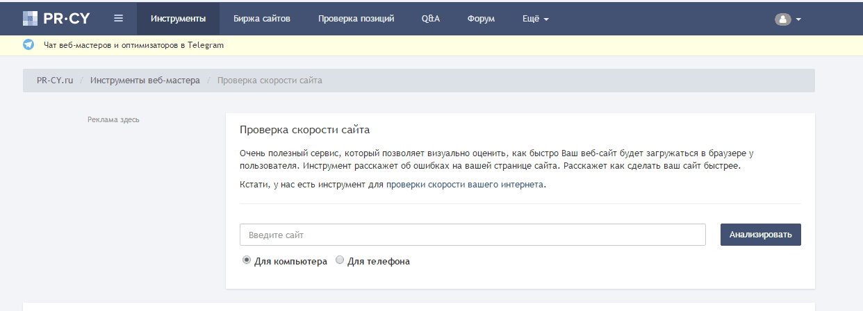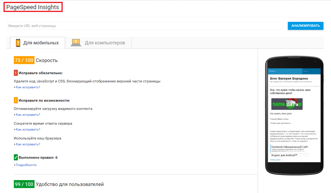 Здесь Вы сможете проверить скорость загрузки сайта как для компьютера. так и для мобильного устройства, что очень удобно.